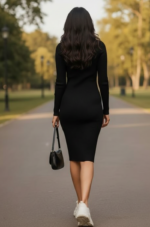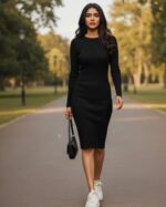A simple, long-sleeved black dress made of stretchy, ribbed fabric. It fits close to the body and ends just below the knees. It has a plain round neck and a clean, solid-coloured design.