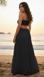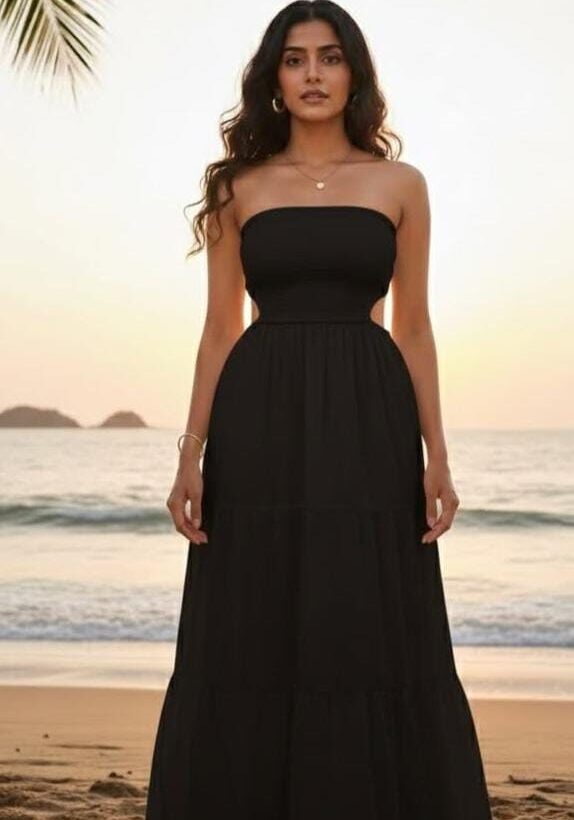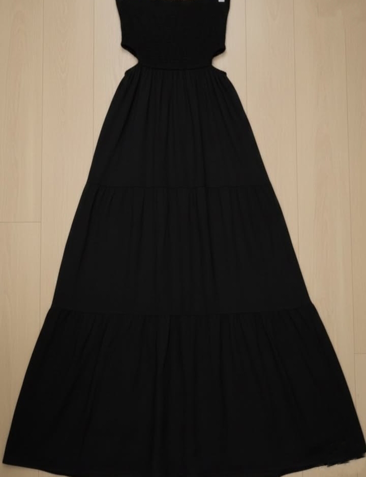 This features a classic, ethereal black maxi dress that is perfect for a beach or summer setting. The top features smocking or shirring, which creates a stretchy, gathered elastic texture. . There appear to be subtle side cut-outs at the waist, transitioning the fitted bodice into the loose skirt. This is a full length white maxi dress. The skirt is tiered, featuring volume and “boho-chic” flared effect