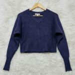 This navy blue sweater features a classic V-neckline with a wide ribbed trim. It is designed with a modern, cropped silhouette and dropped shoulders that create a relaxed, comfortable fit. The sleeves are notable for their extra-long ribbed cuffs, which taper the arm and add a structured detail to the overall soft, knit texture